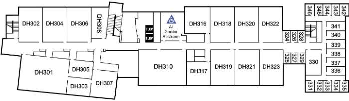 - Faculty Offices, DH324 through DH346 - From the top of the stairwell and the elevators, turn left. The faculty offices are located at the end of the classroom hallway
