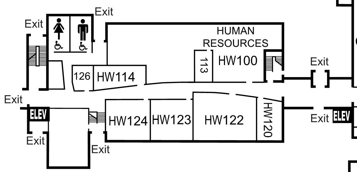 - Human Resources, Room HW100 - If entering from the Quad entrance closest to Clark Library, turn to the right. HW100 is the first office on the right, just beyond the breezeway.