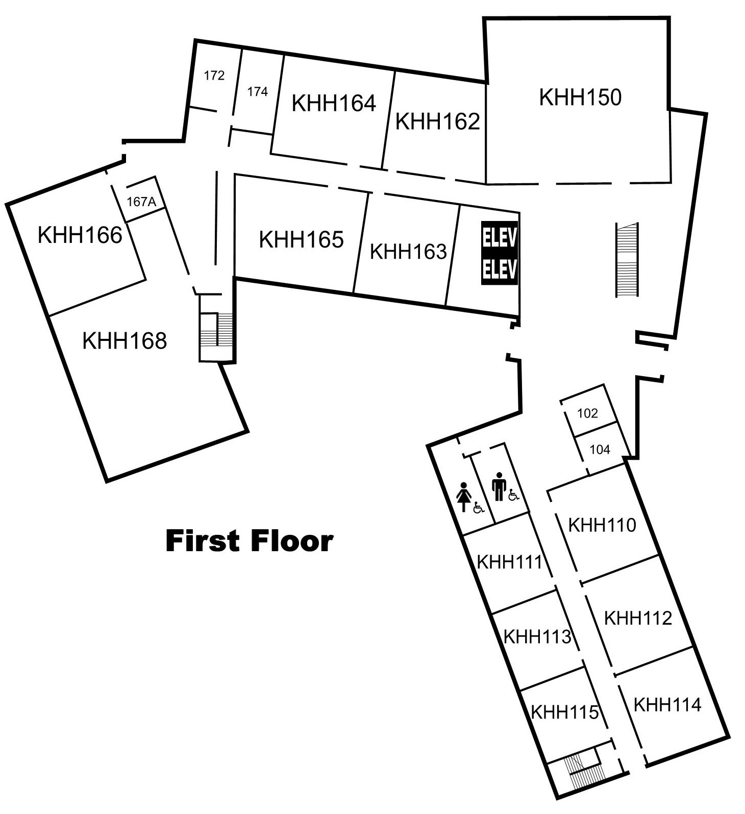Restrooms - If entering the building from the Quad, turn left in the main lobby and head towards the classroom hallway. The restrooms are across from KHH102 and KHH104 and the open seating area.