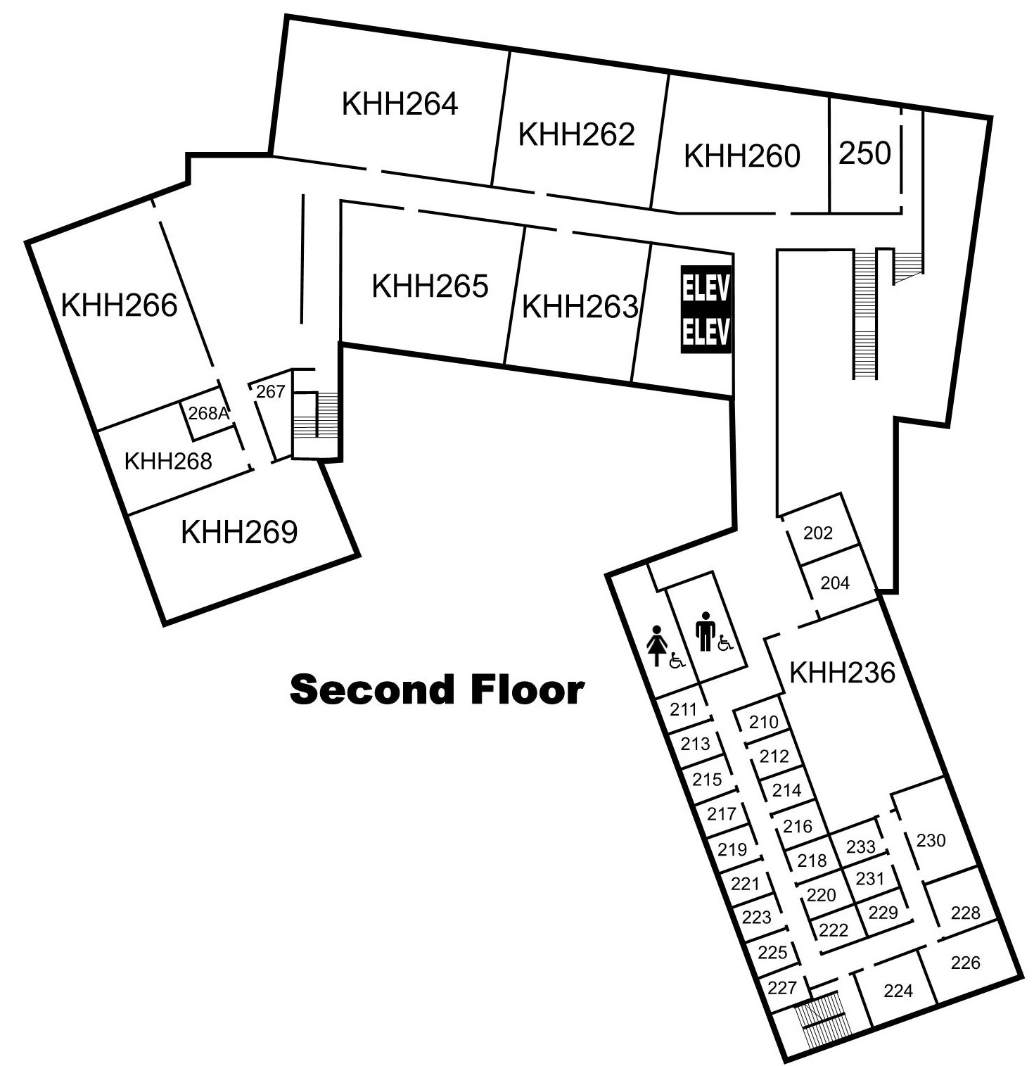 Restrooms - If entering from the elevator, turn right towards the faculty offices. The restrooms are across from KHH202/KHH204 and the open seating area.