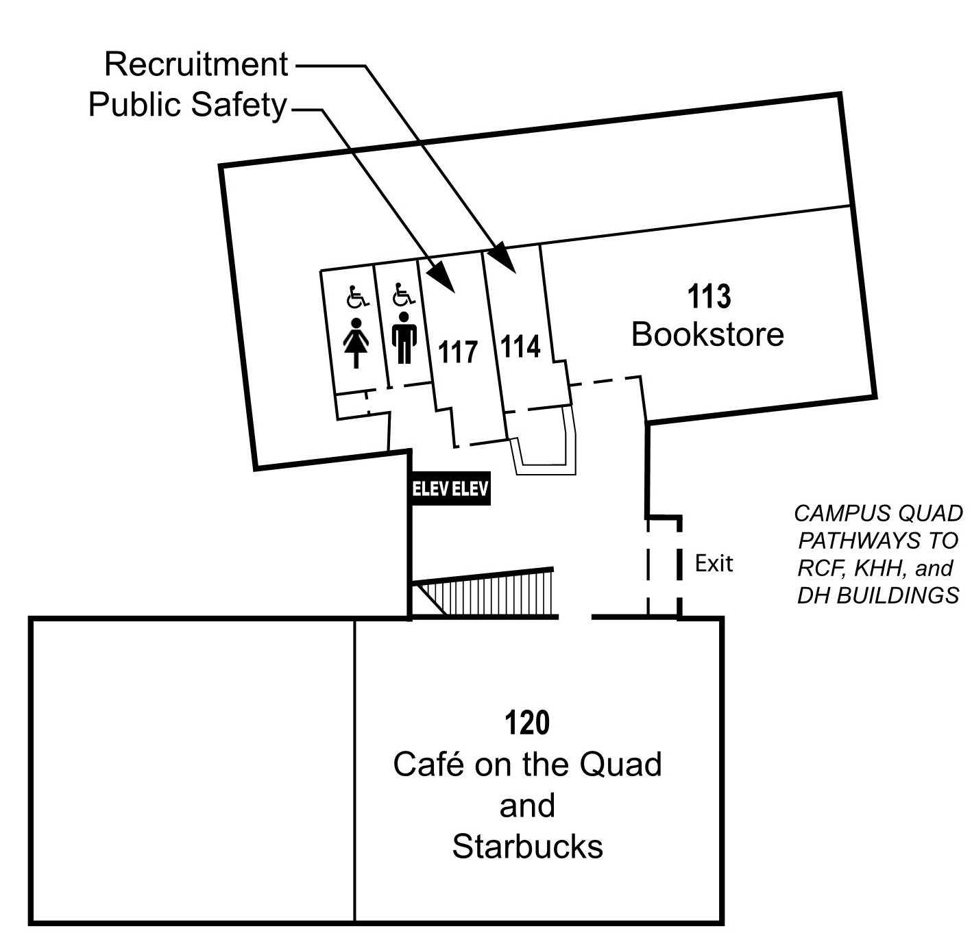 Restrooms - To the left of the Office of Public Safety